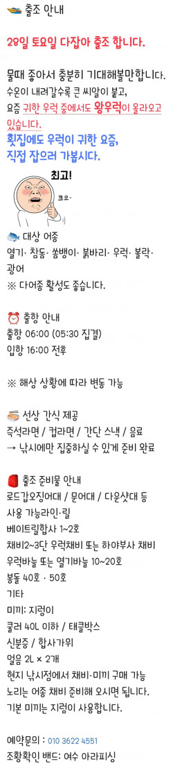 ⚓️여수 아라피싱호 예약 안내 ⚓️ ⭐️예약문의 : 010-3622-4551 , 010-5629-7913⭐️입금계좌 : 2020.4606.9103 수협 최재성⭐️오시는길 : 전